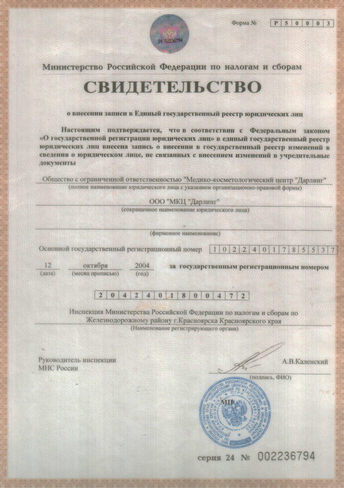 1. Свидетельство о внесении записи в Единый государственный реестр юридических лиц: