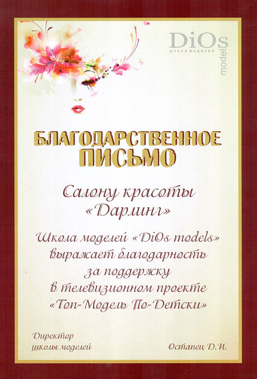 С 19 по 25 августа 2013 года в Красноярске состоялся конкурс "Топ модель по-детски", организатором которого является детское модельное агентство "DiOs models". Салон красоты "Дарлинг" - партнер мероприятия.