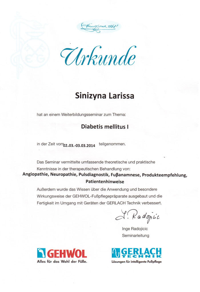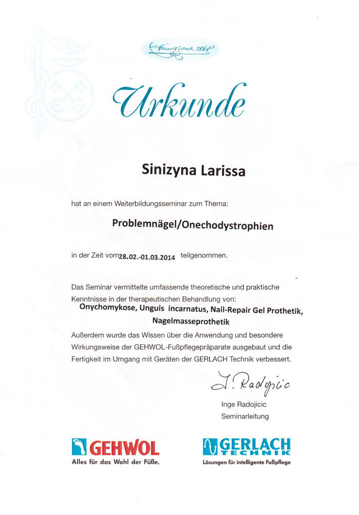 Специалист в области маникюра и педикюра салона красоты "Дарлинг" Синицына Лариса успешно прошла базовый курс и практический тренинг данного курса и по окончании получила сертификаты международного образца фирмы Gerlach и Учебного Центра «Пластэк-Сибирь».