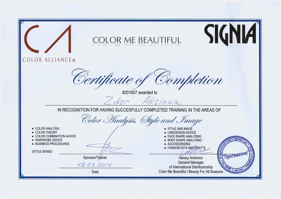С 12 марта 2016г. Здор Аксинья - является сертифицированным консультантом американской компании "Color Me Beautiful / Beauty For All Seasons"
