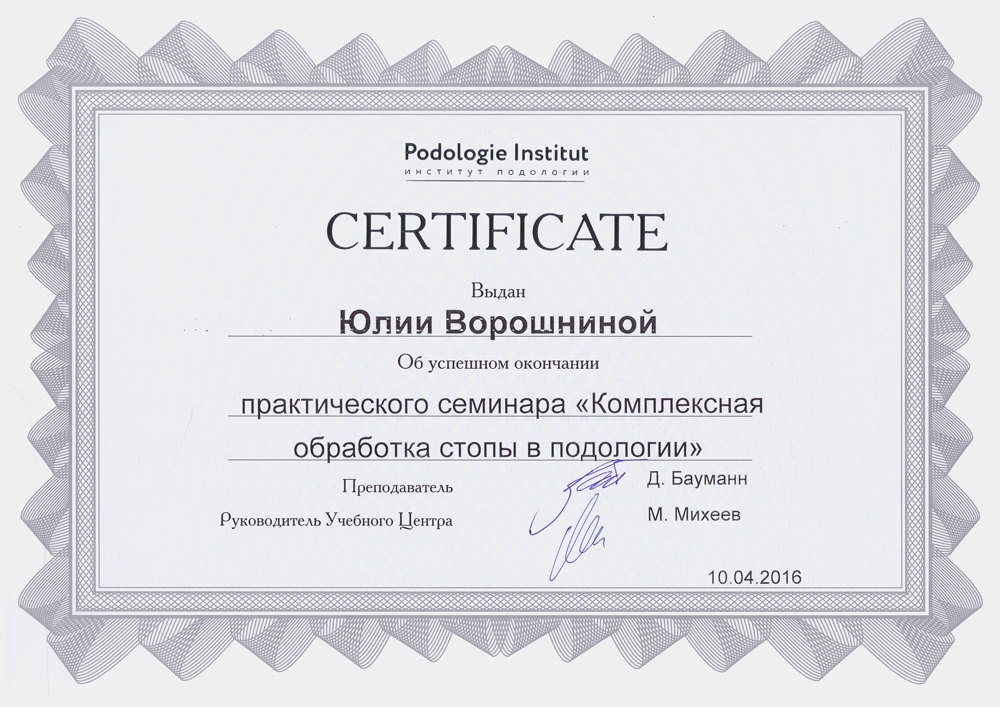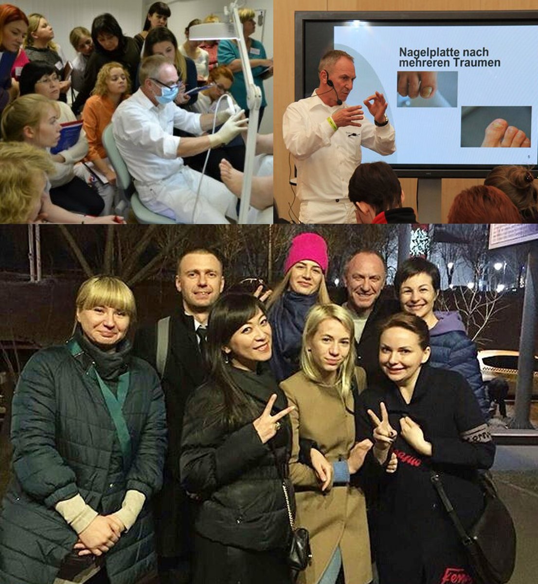 9 - 10 апреля 2016г. в городе Владивостоке, наш сотрудник, мастер по маникюру и педикюру с подологической практикой Ворошнина Юлия прошла обучение с практической отработкой по теме: "Комплексная обработка стопы в подологии", у экс - председателя Союза мастеров педикюра Германии, известного практикующего врача - подолога и преподавателя с международным именем - Дитер Бауманн (Dieter Baumann) Штутгарт, Германия.