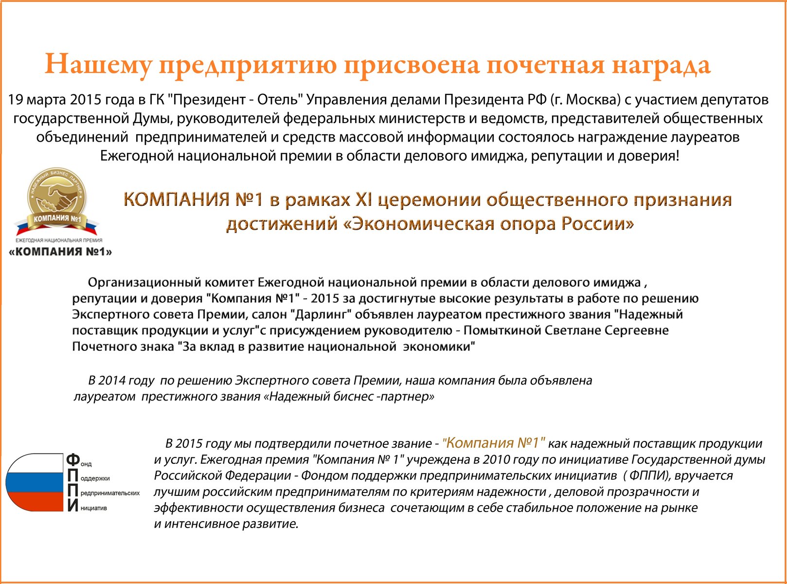 Салон "Дарлинг" - Лауреат Ежегодной национальной премии "КОМПАНИЯ №1 - 2015"