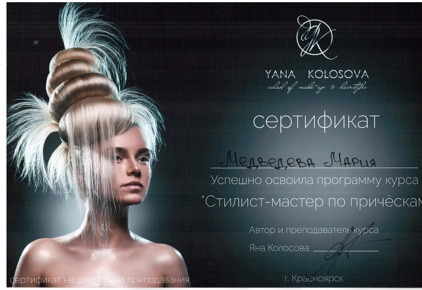 10 августа 2016г. мастер по парикмахерскому искусству и визажу Медведева Мария успешно окончила курс "Стилист -мастер по прическам" от ведущего стилиста по прическам и макияжу Яны Колосовой.