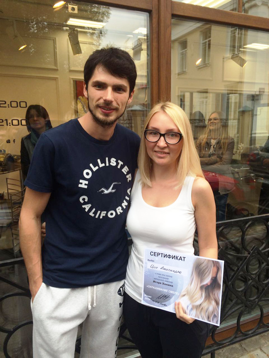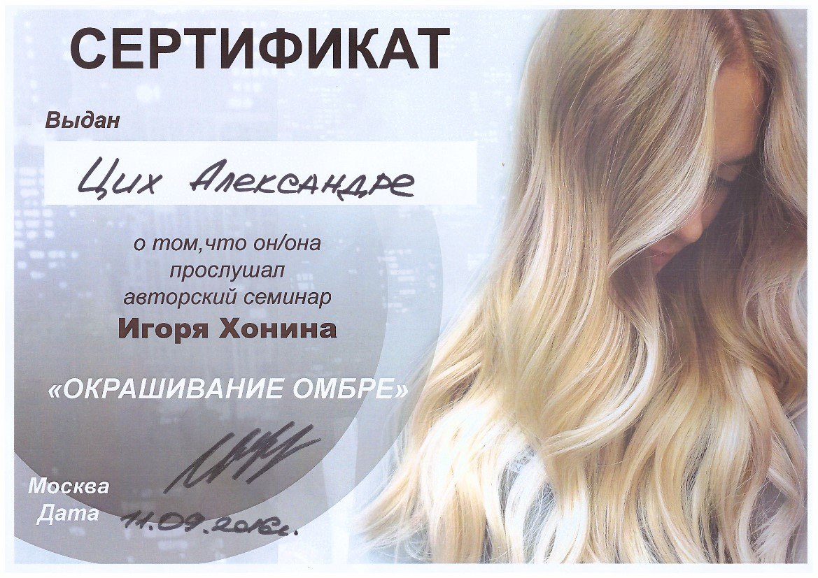 11 сентября 2016г. в г. Москве мастер по парикмахерскому искусству и визажу Цих Александра успешно окончила авторский семинар звездного стилиста Игоря Хонина "ОКРАШИВАНИЕ ОМБРЕ".