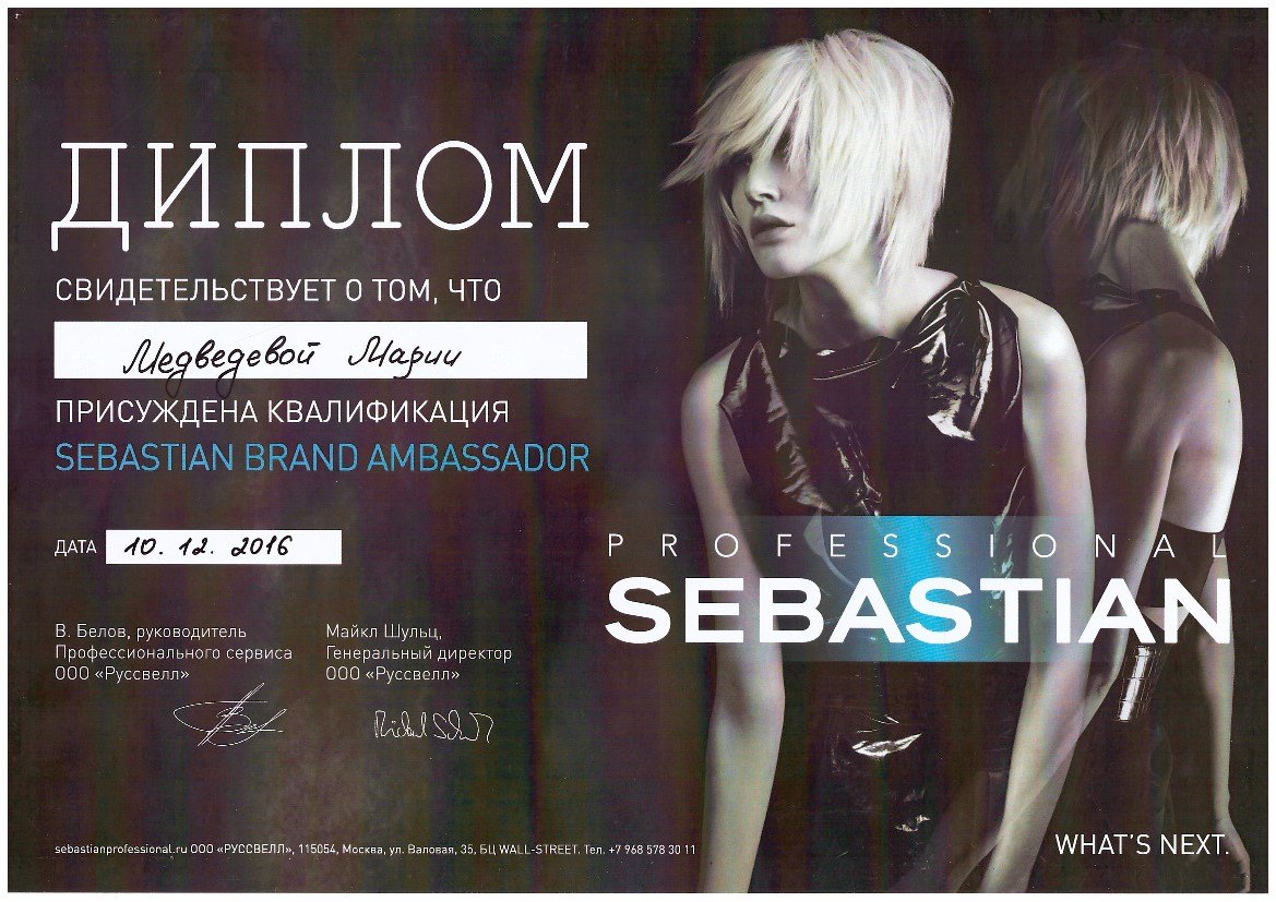 10-11 декабря 2016 г. в г. Москве, в обучающем центре Wella Мария Медведева успешно прошла третий тренинг двухгодовой программы "АМБАССАДОР SEBASTIAN" . Тренинг провели старший тренер "Sebastian Professional" Андрей Брызгалов и тренер "Sebastian Professional" Майя Пак. В программе тренинга : тестирование (теория) ; практическая работа в стиле FLOW, FORM, FLAUNT. По окончанию тренинга была присуждена квалификация SEBASTIAN BRAND AMBASSADOR с выдачей диплома.