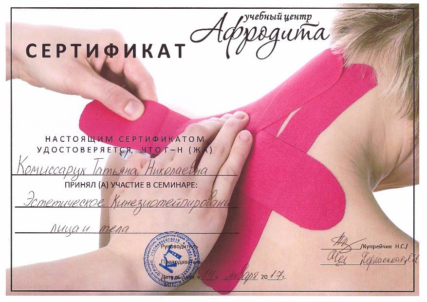 14 января 2017 г. Косметолог Татьяна Комиссарук приняла участие в семинаре учебного центра "Афродита" "Эстетическое кинезиотейпирование лица и тела"