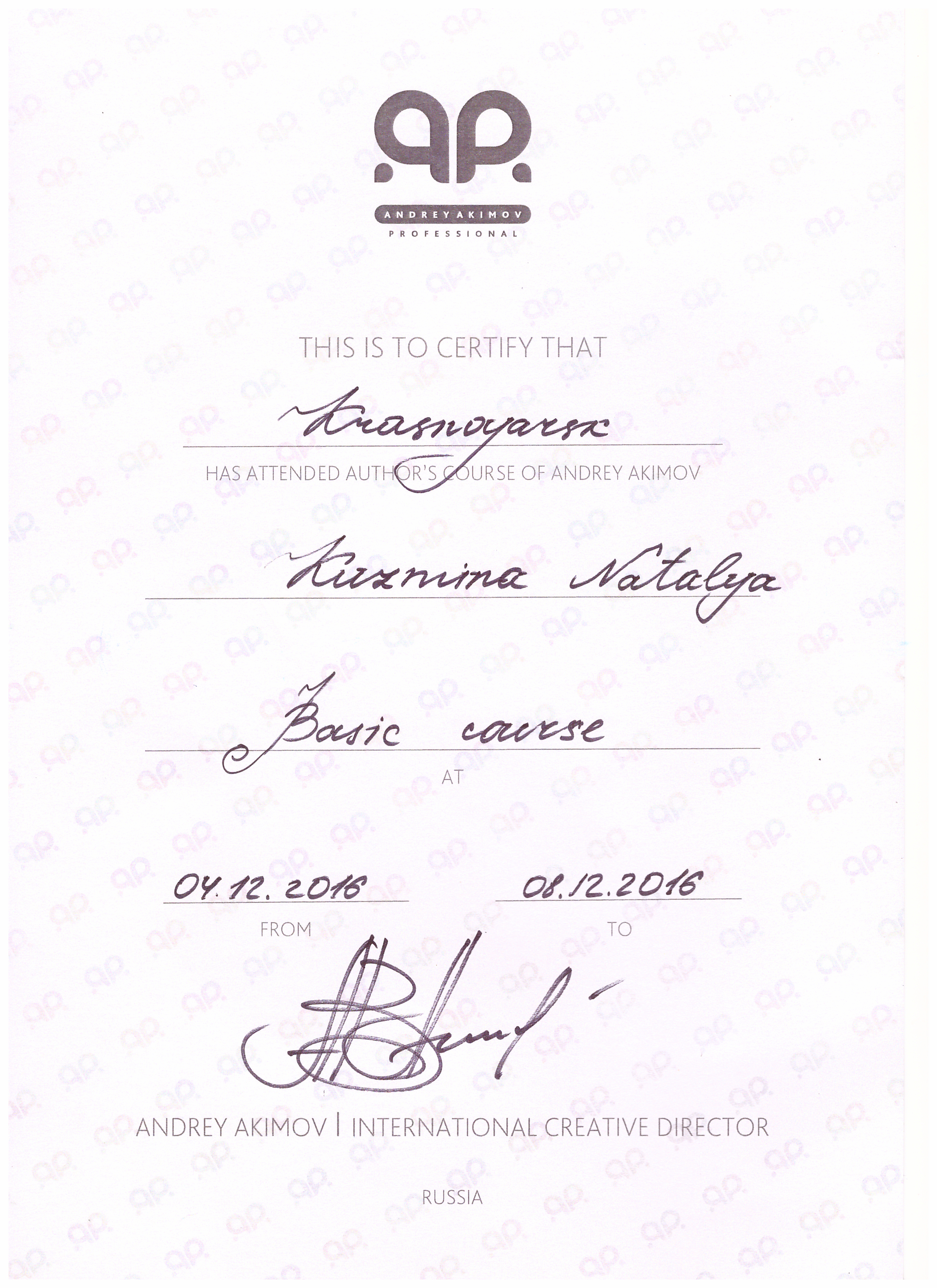 Декабрь 2016 г. Красноярск, Студия красоты "Дарлинг" - первый "Постановочный курс"/" BASIC COURSE" по программе SACO ACADEMY PROFESSIONAL EDUCATION " Основы классической стрижки"/"Classic Foundation Cutting" .Программа ANDREY AKIMOV by AUTHENTICA предполагает пятиступенчатую систему обучения "5 шагов". Курс основан на комбинации демонстрации, теории и практической отработке английской технике стрижек. Авторский курс провел сертифицированный тренер ведущей британской школы парикмахерского искусства "SACO", стилист, прошедший преподавательский курс в академии "Vidal Sassoon"," Архитектор волос", ежегодный участник различных парикмахерских мероприятиях и выставок в Астане, Лондоне, Нью-Йорке, а также творческий партнёр компании Wella. (г. Иркутск) - Акимов Андрей.