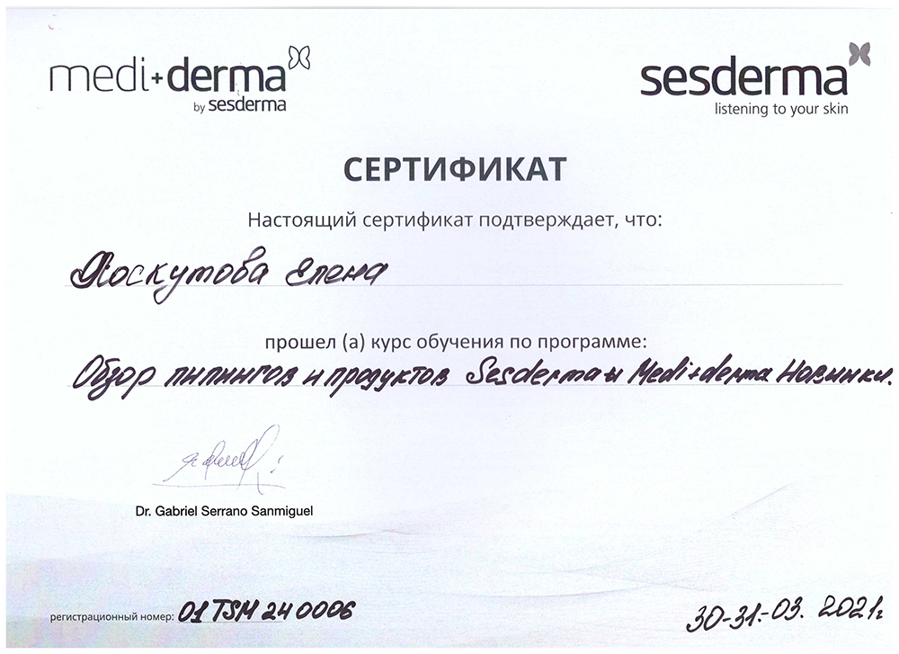 Ноябрь 2013г., Москва, " ООО" Астрея" - курс обучения по программе: Применение профессиональных космецевтических средств MEDIADERMA/SESDERMA/DIETSES в салонных процедурах по подготовке и проведению химических пилингов и в постпилинговом уходе.