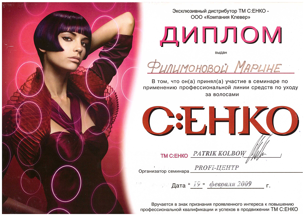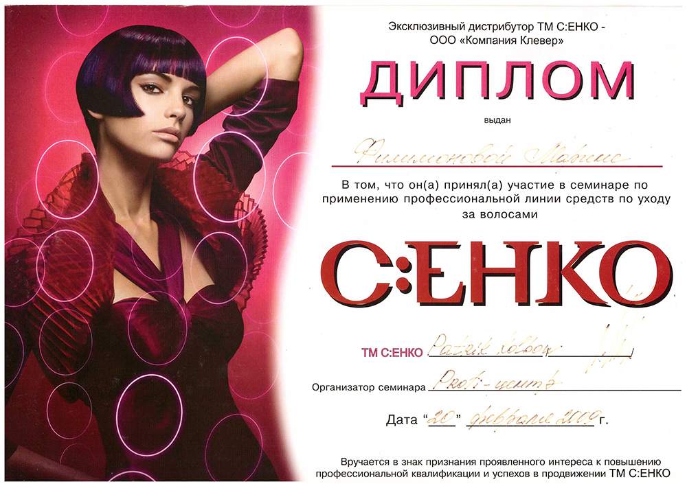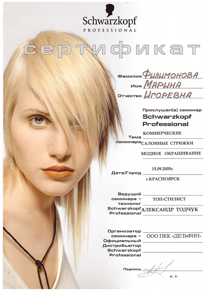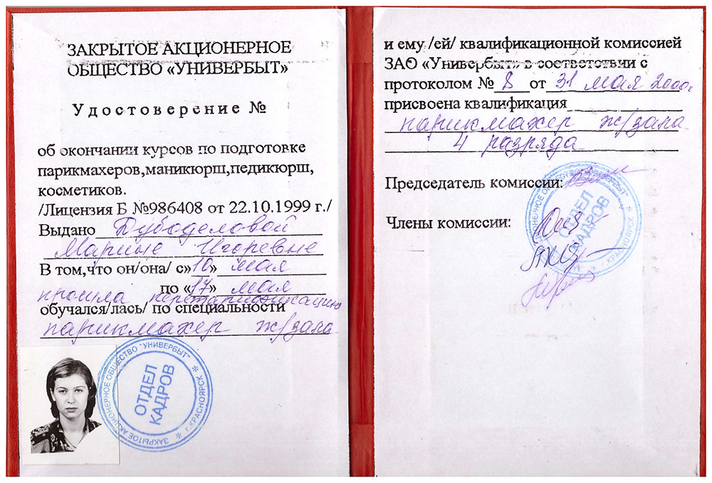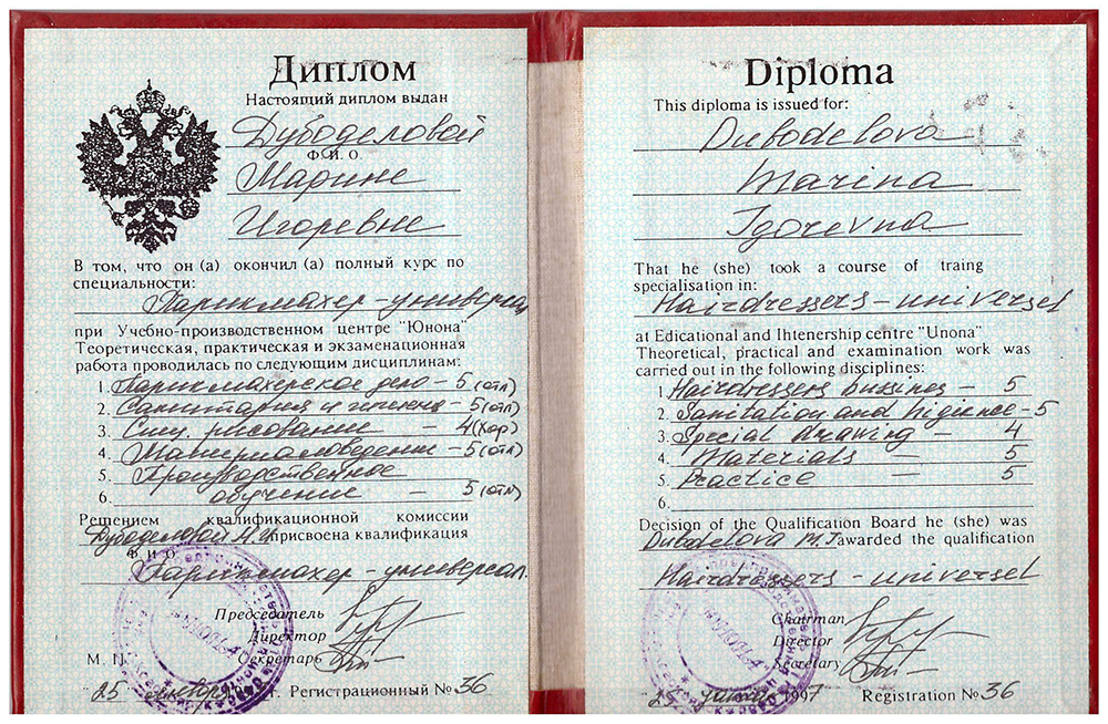 Январь 1997 г., Санкт - Петербург, Учебно – производственный центр «Юнона» - курс по специальности «Парикмахер – универсал». Присвоена квалификация «Парикмахер – универсал».
