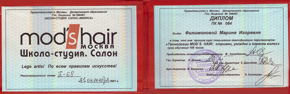 Октябрь 2001 г., Москва, Школа – студия. Салон «Милиса» - повышение квалификации парикмахеров: «Технологии MOD’S HAIR: стрижки, укладки и окраска волос»