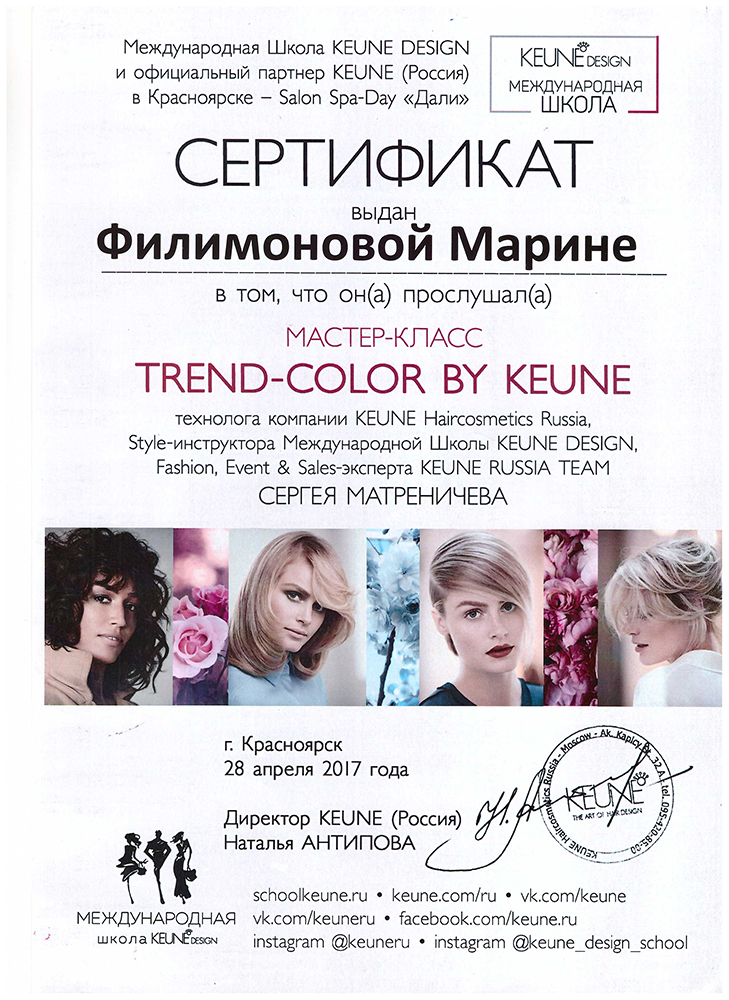 Апрель 2017 г., Красноярск, Международная школа KEUNE DESIGH – мастер – класс TREND – COLOR BY KEUNE технолога компании KEUNE Haircosmetics Russia, Style – инструктора Международной школы KEUNE DESIGH, Fashion , Event & Sales – эксперта KEUNE RUSSIA TEAM Сергея Матреничева.