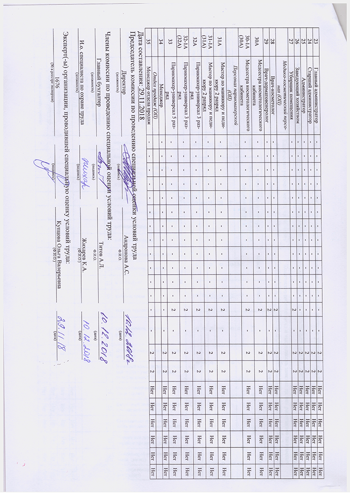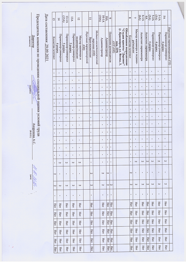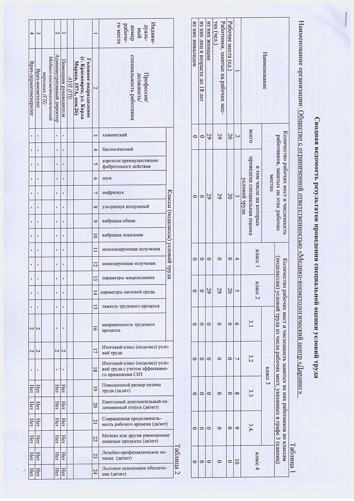 Сводная ведомость результатов проведения специальной оценки условий труда