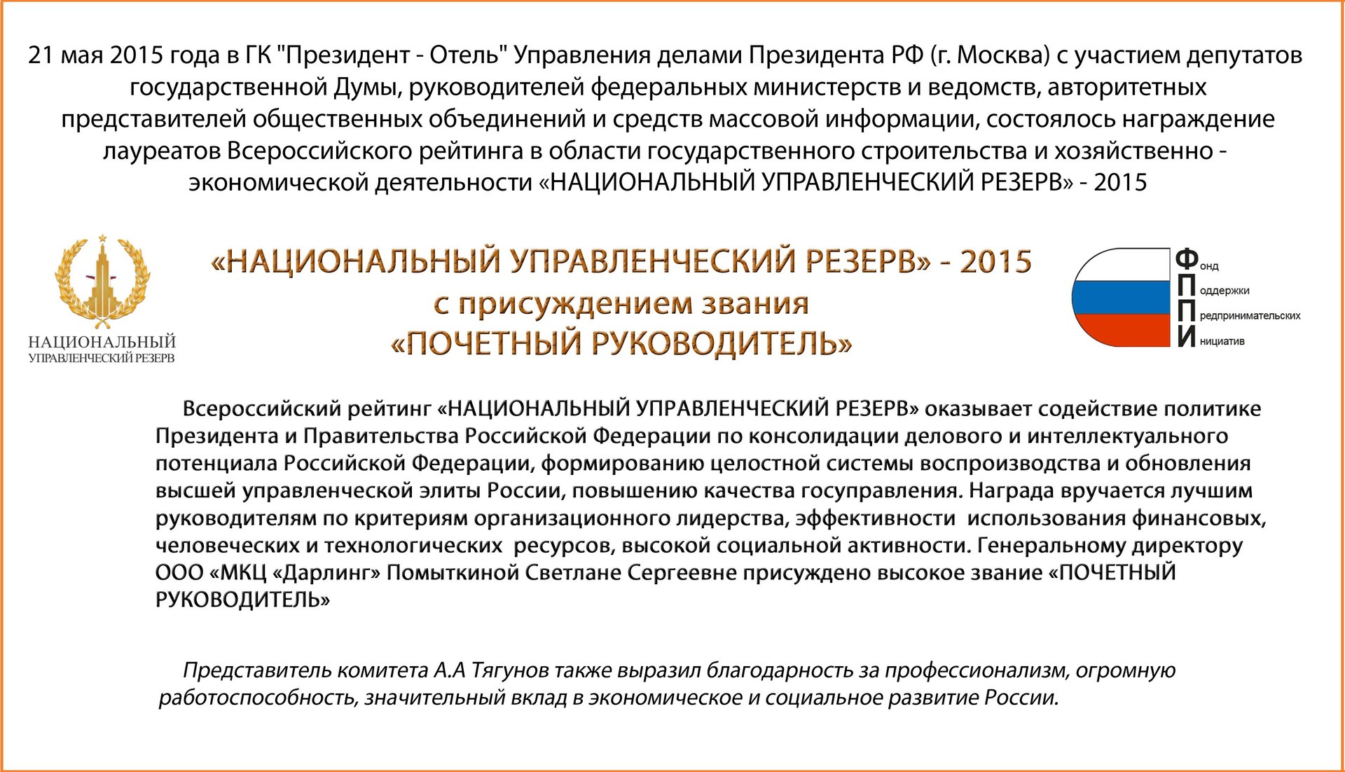 Салон "Дарлинг"- Лауреат Ежегодной премии "Национальный управленческий резерв" -2015