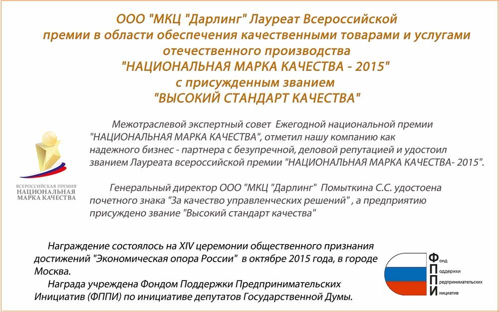 Салон "Дарлинг" - Лауреат Всероссийской премии "НАЦИОНАЛЬНАЯ МАРКА КАЧЕСТВА - 2015"