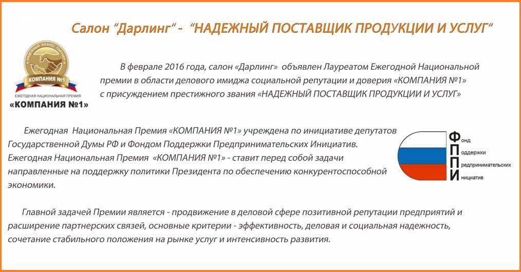 Салон "Дарлинг" - Лауреат Ежегодной национальной премии "КОМПАНИЯ №1 - 2016"
