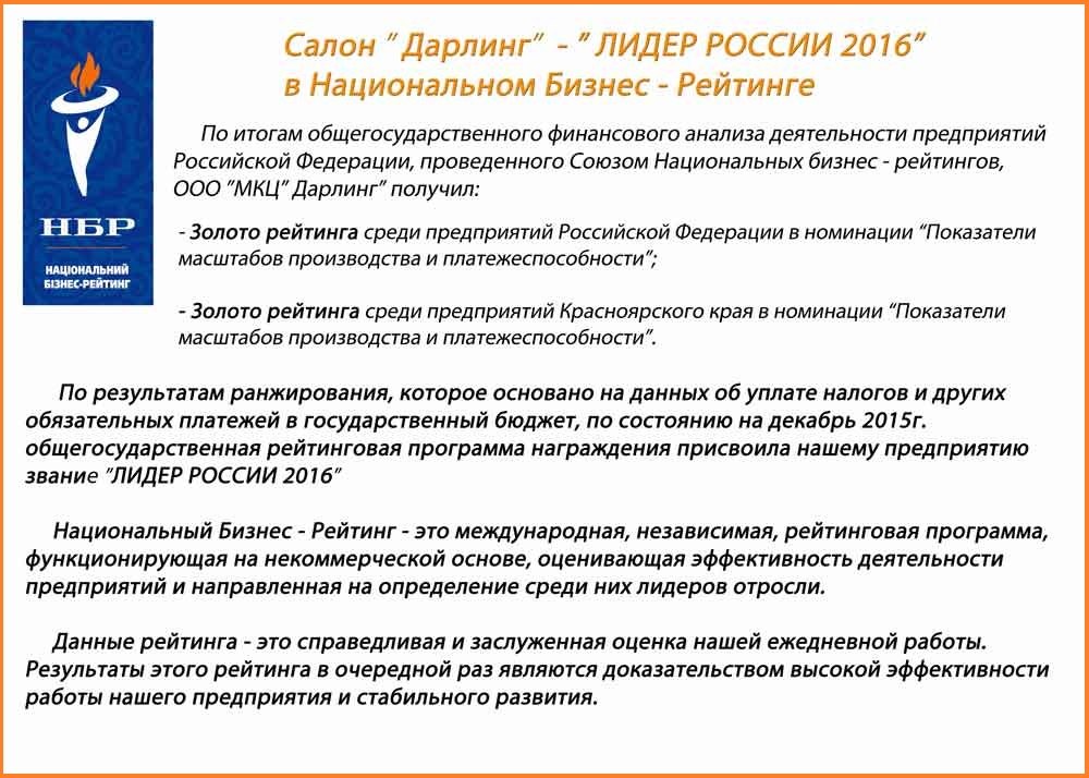 Салон "Дарлинг" - Лауреат Ежегодной национальной премии "ЛИДЕР РОССИИ 2016"