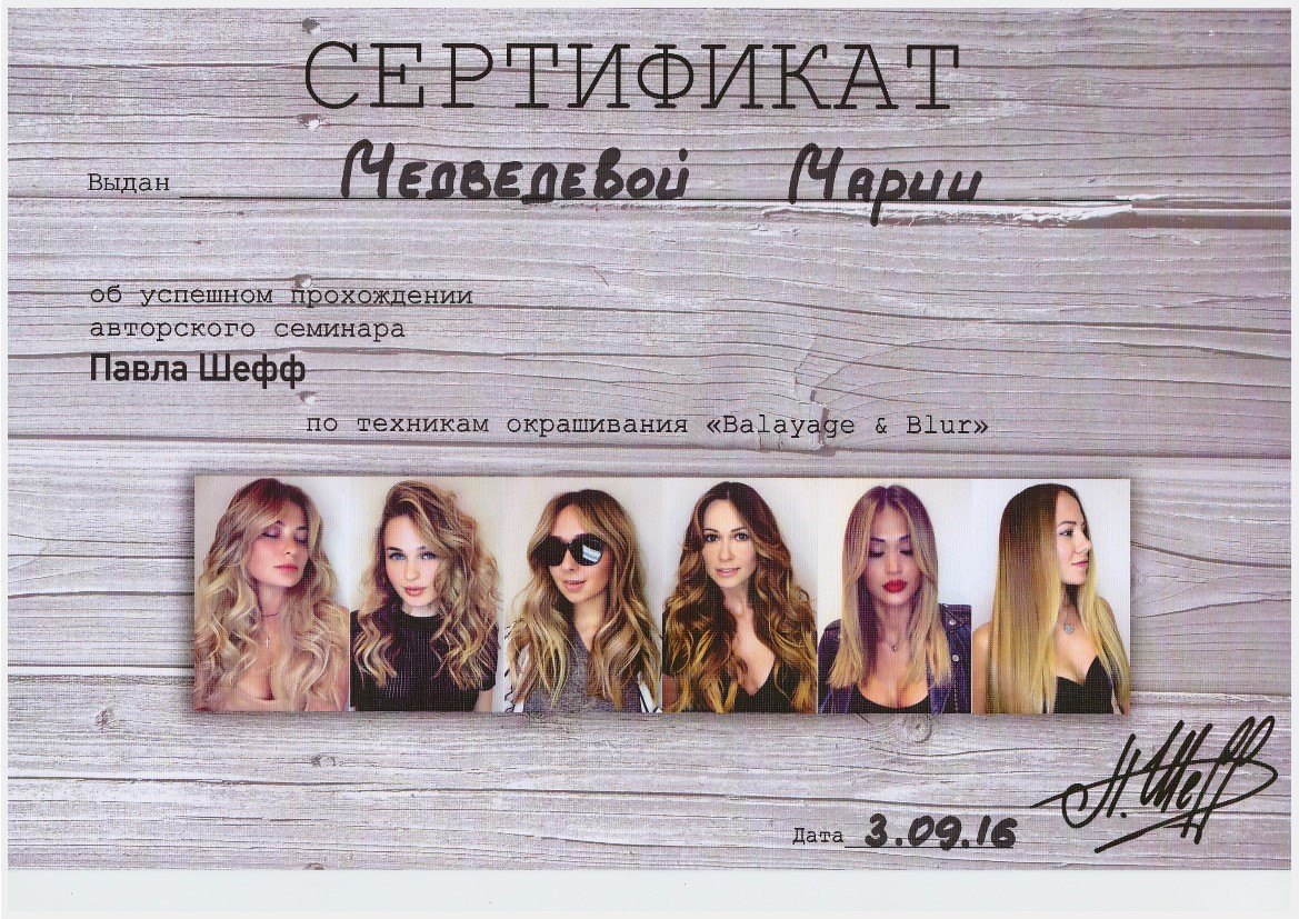 3 сентября 2016г. в г. Москве, мастер по парикмахерскому искусству и визажу Медведева Мария успешно окончила авторский мастер - класс Павла Шефф по техникам окрашивания "BALAYGE & BLUR"