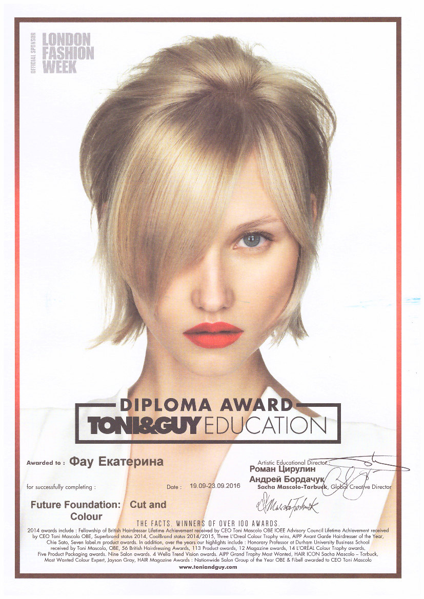 С 19 по 23 сентября 2016г., в Московской академии TONI&GUY, мастер по парикмахерскому искусству Фау Екатерина успешно окончила курс TONI&GUY EDUCATION "FUTURE FOUNDATION: CUT AND COLOUR" . Преподаватели курса Роман Цирулин - Artistic Educational Director, Андрей Бордачук - Global Creative Director.