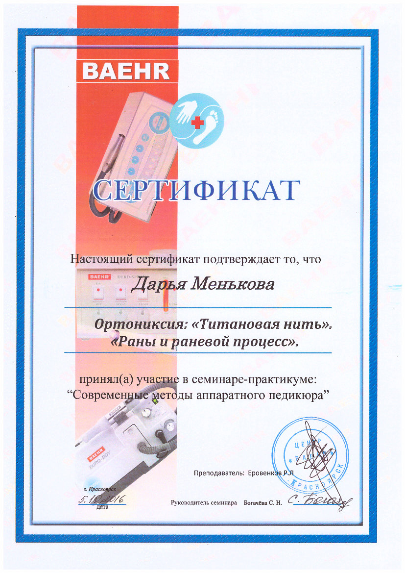 5 октября 2016 г. в г. Красноярске в центре "BAEHR" мастер по маникюру, педикюру и моделированию ногтей Менькова Дарья приняла участие в семинаре - практикуме : "Современные методы аппаратного педикюра"