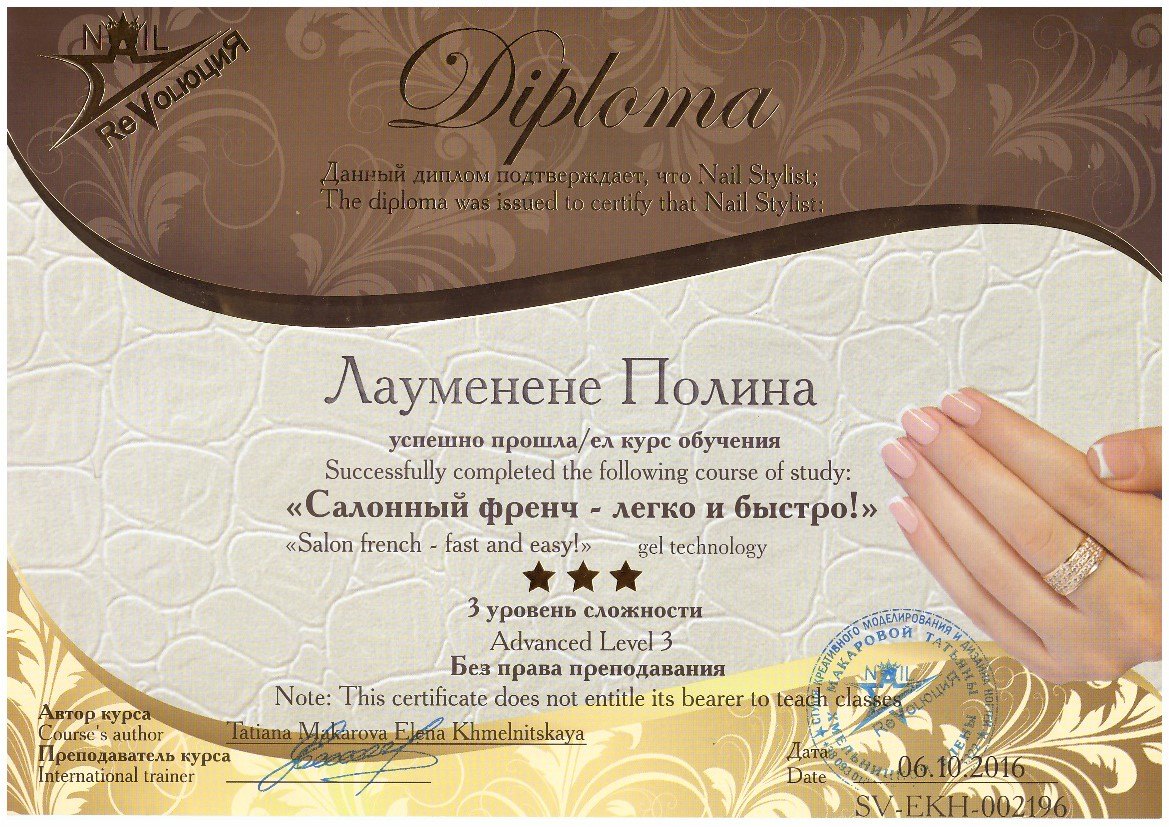 С 3 по 6 октября 2016 г. в г. Красноярске в учебном центре "NOGTIKA" мастер по маникюру, педикюру и моделированию ногтей Лауменене Полина успешно закончила авторский курс Хмельницкой Елены: "Салонный френч - легко и быстро!" ( продвинутый 3 уровень сложности)