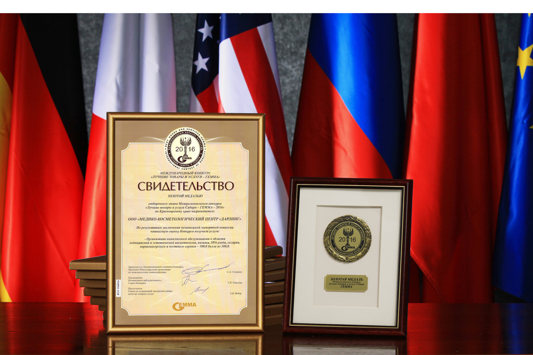 В мае 2016 года Организационным комитетом Международного конкурса «Лучшие товары и услуги – ГЕММА», по результатам ежегодного мониторинга в сфере качества производимой продукции и оказываемых услуг в Сибирском федеральном округе, салону красоты «Дарлинг» было рекомендовано представлять Красноярский край в 2016 году в отборочном этапе Международного конкурса «Лучшие товары и услуги – Гемма» в номинации «Организация комплексного обслуживания в области медицинской и эстетической косметологии, визажа, СПА-ухода, парикмахерского и ногтевого сервиса».