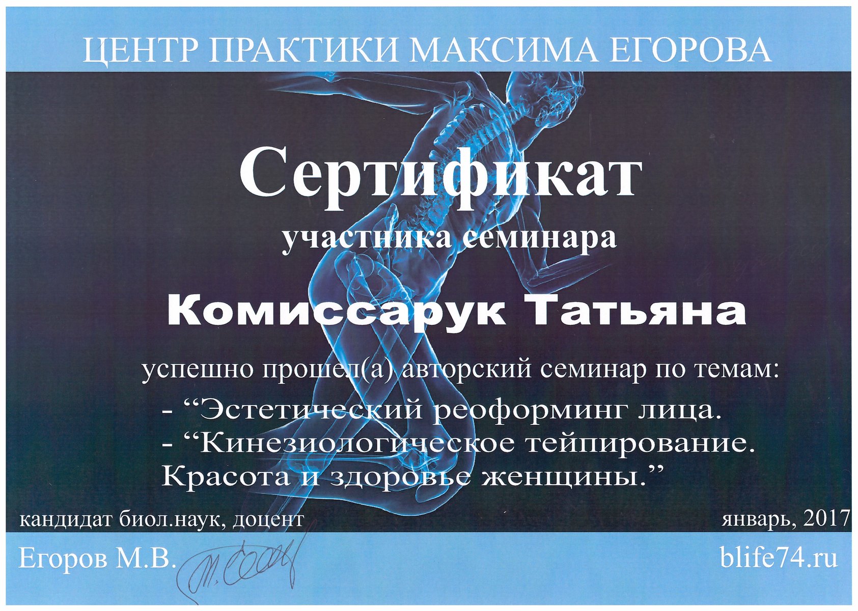 С 26 по 29 января 2017 г. в г. Новосибирске, в Центре практики Максима Егорова, косметолог салона красоты "Дарлинг" Татьяна Комиссарук прошла обучение на авторском семинарет Максима Егорова "Эстетический реформинг лица. Кинезиологическое тейпирование. Красота и здоровье женщины."