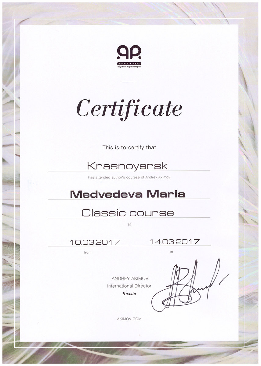 Андрей Акимов - сертифицированный тренер ведущей британской школы парикмахерского искусства "SACO", стилист, прошедший преподавательский курс в академии "Vidal Sassoon"," Архитектор волос", ежегодный участник различных парикмахерских мероприятиях и выставок в Астане, Лондоне, Нью-Йорке.