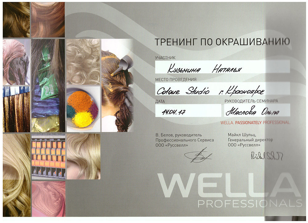 14 апреля 2017г. мастер по парикмахерскому искусству и визажу Наталья Кузьмина прошла обучающий тренинг по окрашиванию от Wella Professionals.