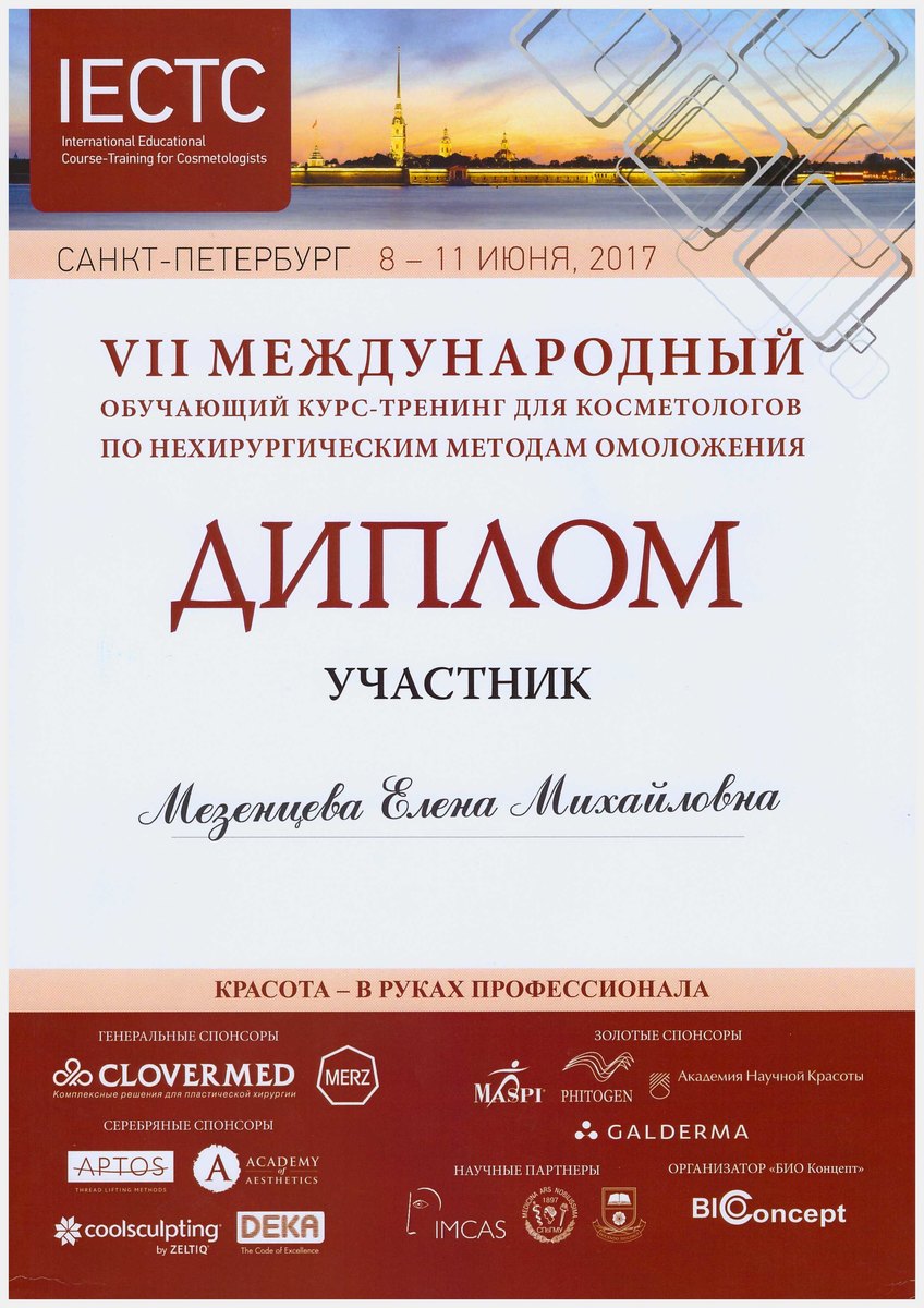 С 8 по 11 июня 2017г., в Санкт - Петербурге, главный врач, врач-косметолог Елена Мезенцева приняла участие в VII международном обучающем курс-тренинге для косметологов по нехирургическим методам омоложения - IECTC-2017.
