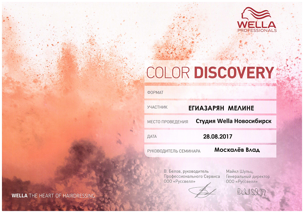 C 28 августа по 1 сентября 2017г., в г. Новосибирске, в студии Wella парикмахер салона красоты "Дарлинг" Мелине Егиазарян прошла обучение на семинарах "СOLOR DISCOVERY", "ESSENTIAL COLOR", "COLOR CRAFT " от WELLA PROFESSIONALS. Руководители семинаров - Влад Москалев и Алена Михасева.