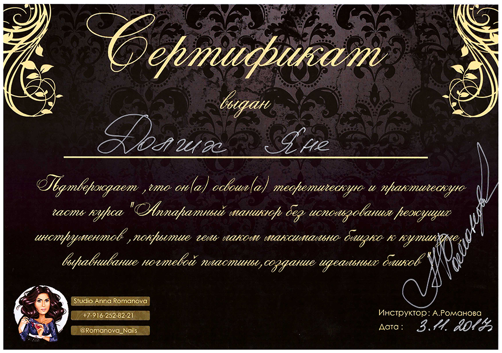 3 ноября 2017г., в г. Новосибирске, мастер по маникюру, педикюру и моделированию ногтей Яна Долгих прошла курс: "Аппаратный маникюр без использования режущих инструментов, покрытие гель - лаком максимально близко к кутикуле, выравнивание ногтевой пластины, создание идеальных бликов"