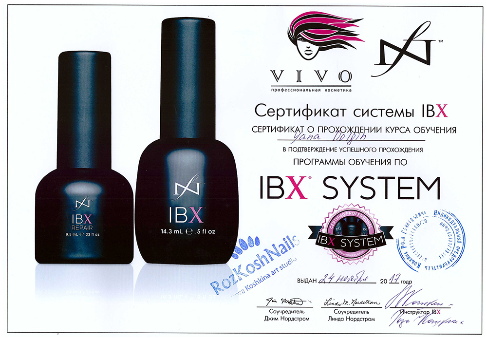 24 ноября 2017г. в г. Красноярске, в студии "RozKoshNails" мастер по маникюру, педикюру и моделированию ногтей Яна Долгих прошла обучение по системе IBX SYSTEM.