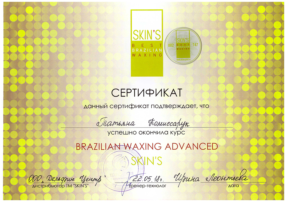 22 мая 2018г., в г. Красноярске, косметолог салона красоты "Дарлинг" Татьяна Комиссарук прошла курс "BRAZILIAN WAXING ADVANCED".