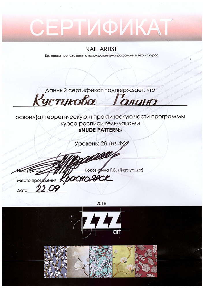 22 сентября 2018 г., мастер по маникюру, педикюру, моделированию ногтей и нейл-дизайну Галина Кустикова прошла теоретическую и практическую часть программы курса росписи гель-лаками "NUDE PATTERN"