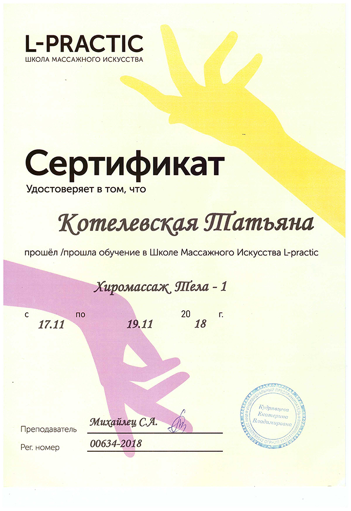 С 17 по 18 ноября 2018 г. в учебном центре ДалиМед косметолог Татьяна Котелевская прошла обучение по программе «Хиромассаж тела»