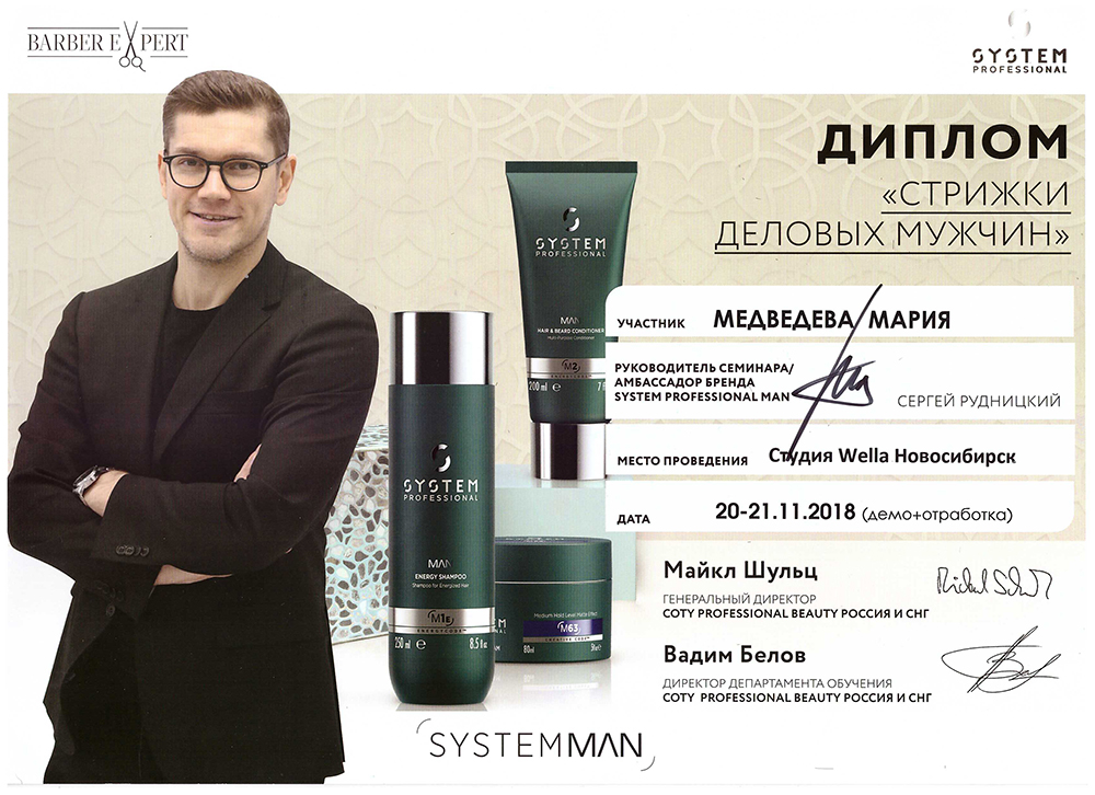 Сергей Рудницкий - Бренд – амбассадор System Professional Man; Чемпион России и Греции; Бронзовый призер чимпионата Восточной Европы; Призер Чемпионата мира; Основатель проекта Barber Expert ; Основатель Мужской парикмахерской Wall Street