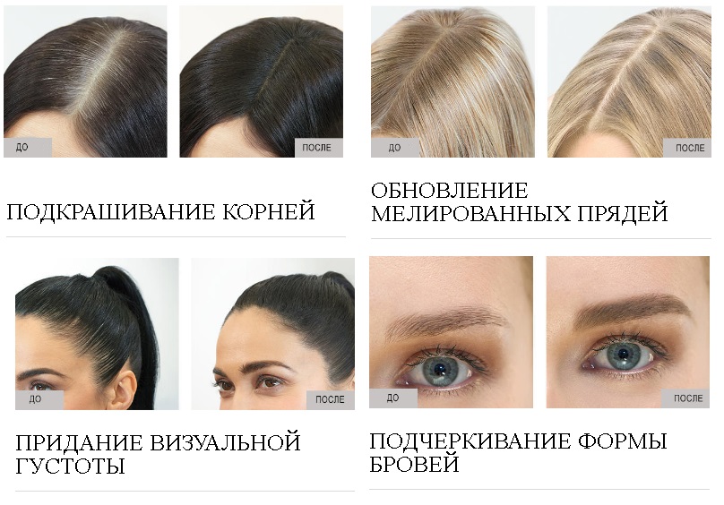 4 решения в одном: закрашивание отросших корней, освежение цвета мелированных прядей, визуальный объем и макияж бровей. ”Умная” кисть-аппликатор гарантирует точное и уверенное нанесение продукта.