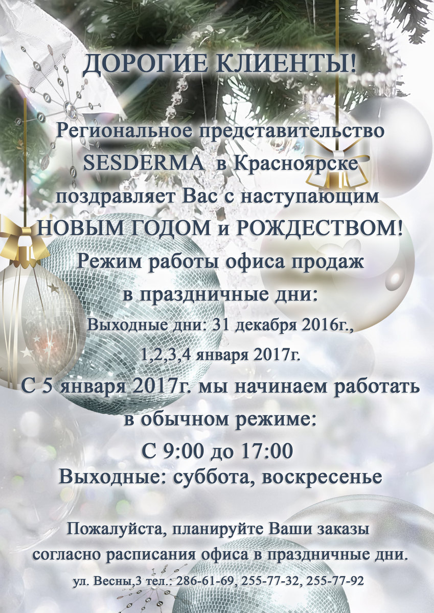 Режим работы регионального представительства SESDERMA в новогодние праздники