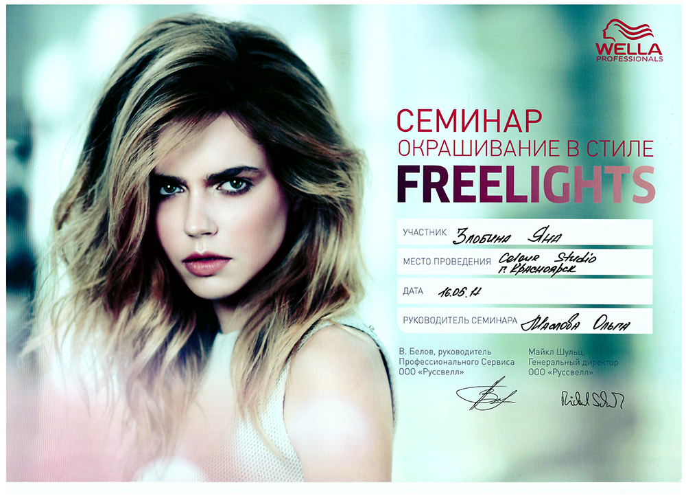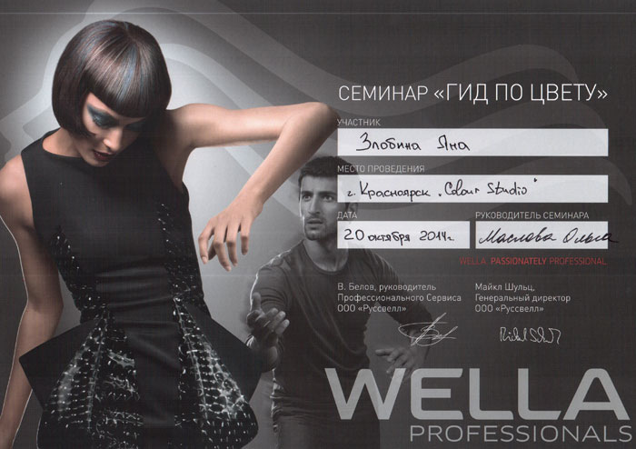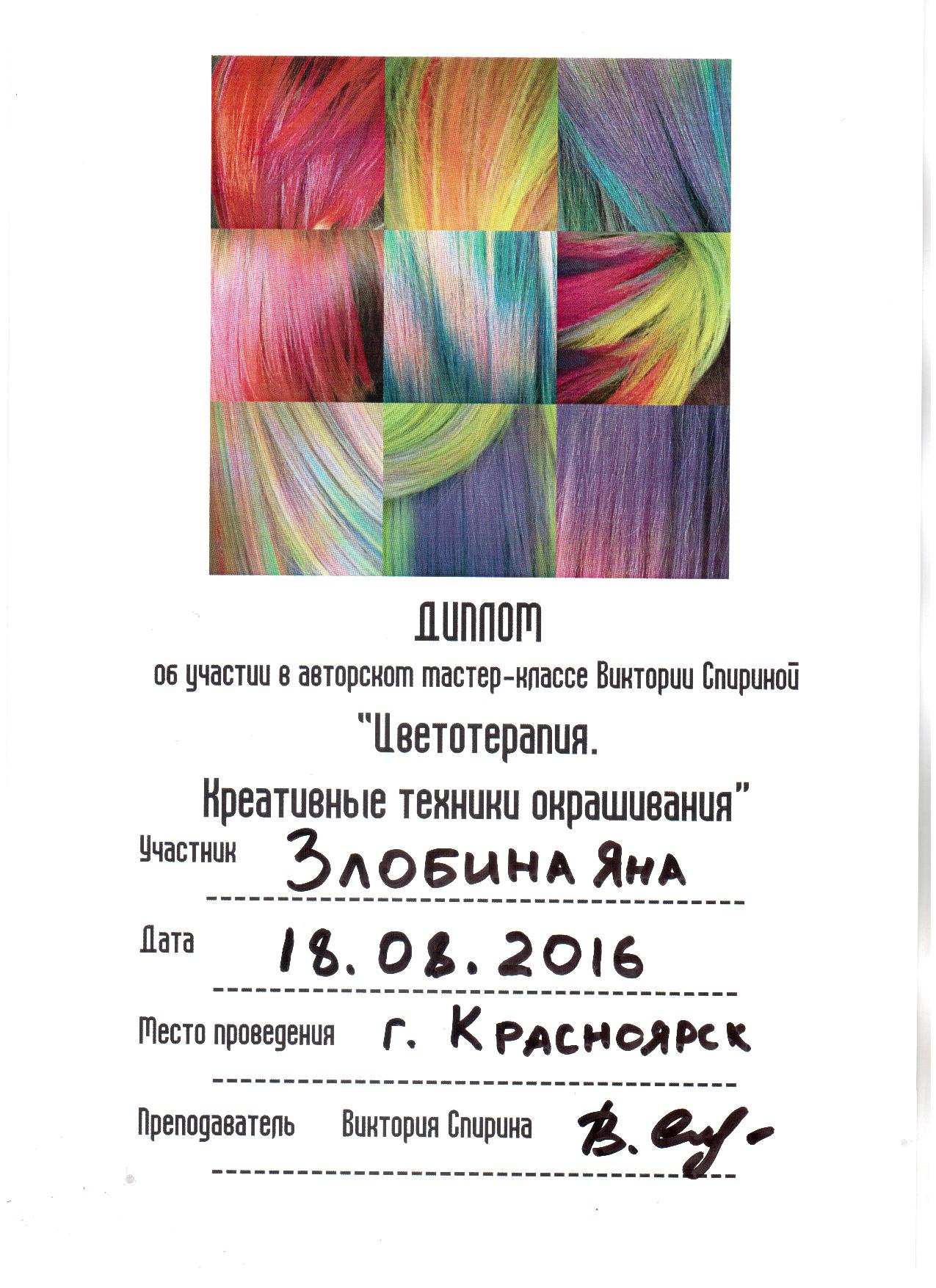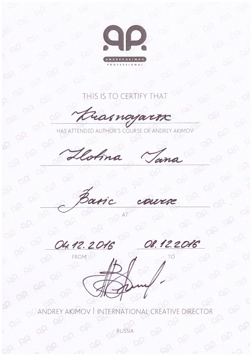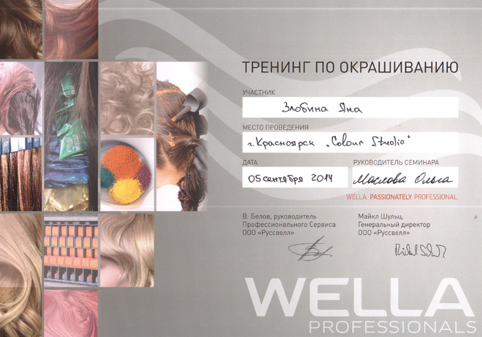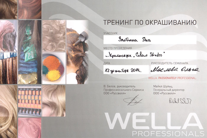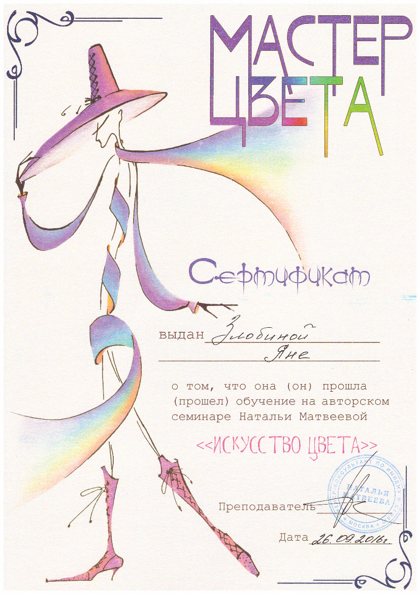 Сентябрь 2016 г. Красноярск, Студия Wella - Авторский семинар "Искусство цвета". Преподаватель Матвеева Наталья, тренер - консультант по имиджу, стилю и цвету Американской компании "Beauty For All Seasons", партнер Академии парикмахерского искусства "Долорес", автор и тренер креативного курса Fashion week по повышению квалификации специалистов в области моды и стиля, автор курса "Имидж-мастер", преподаватель школы Сreate in Riga (Латвия), специалист по цветотерапии компании "Aura Soma". г. Москва. Присвоено звание "Мастер цвета".