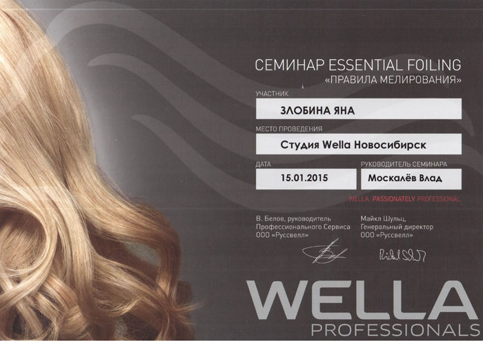 Январь 2015 г. г. Новосибирск, студия Wella– Семинар ESSENTIAL FOILING «Правила мелирования». Различные варианты мелирования и практические упражнения на моделях. Тонкости и нюансы.