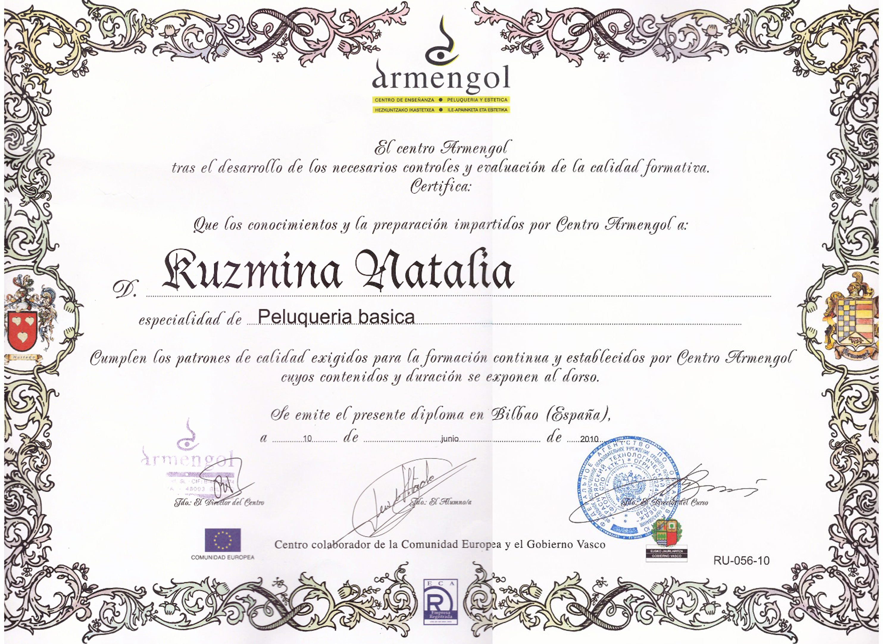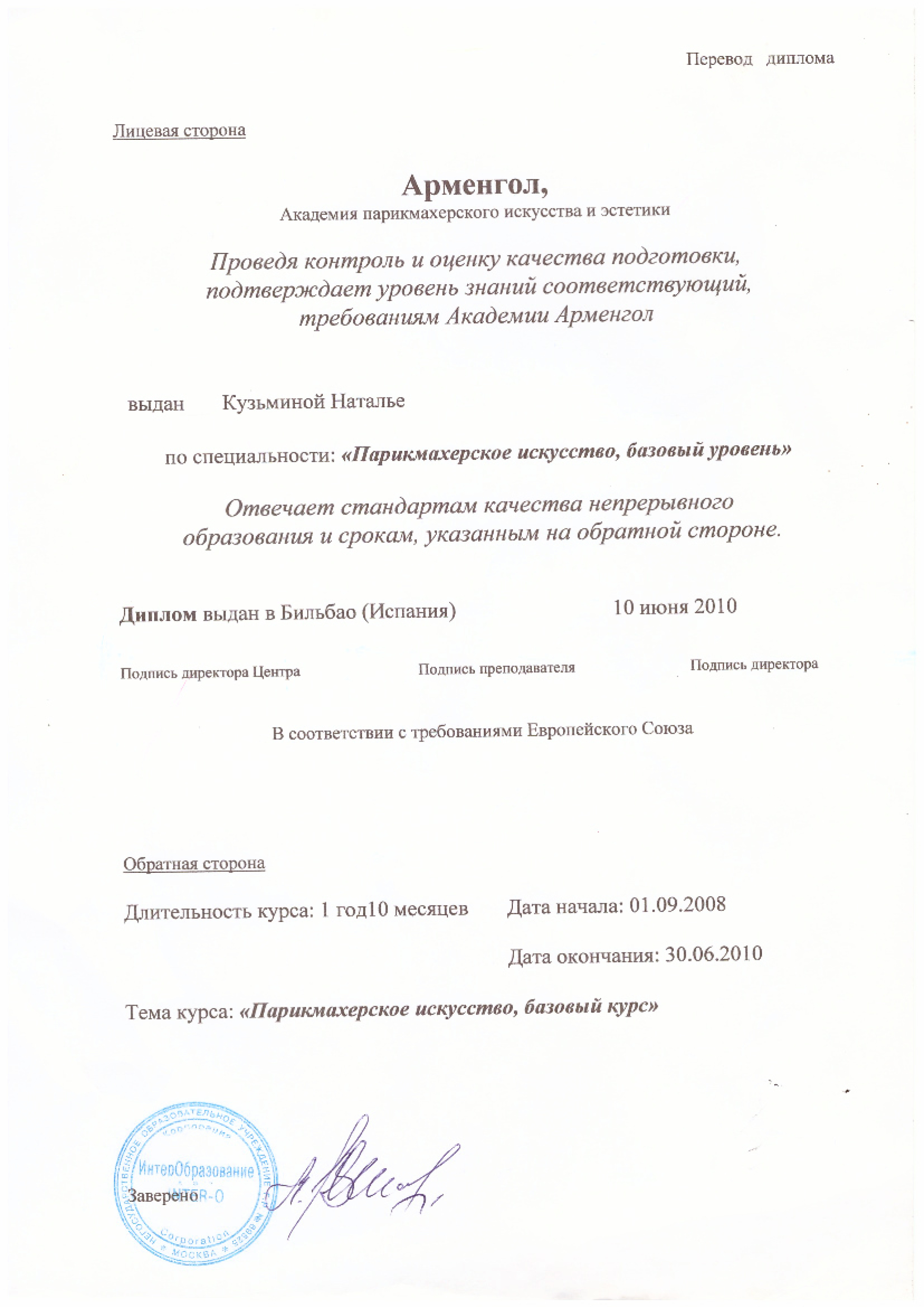 Июль 2010 г., Красноярск, Академия парикмарехского искусства и эстетики - В соответствии с требованиями Европейского Союза "Парикмахерское искусство, базовый уровень"