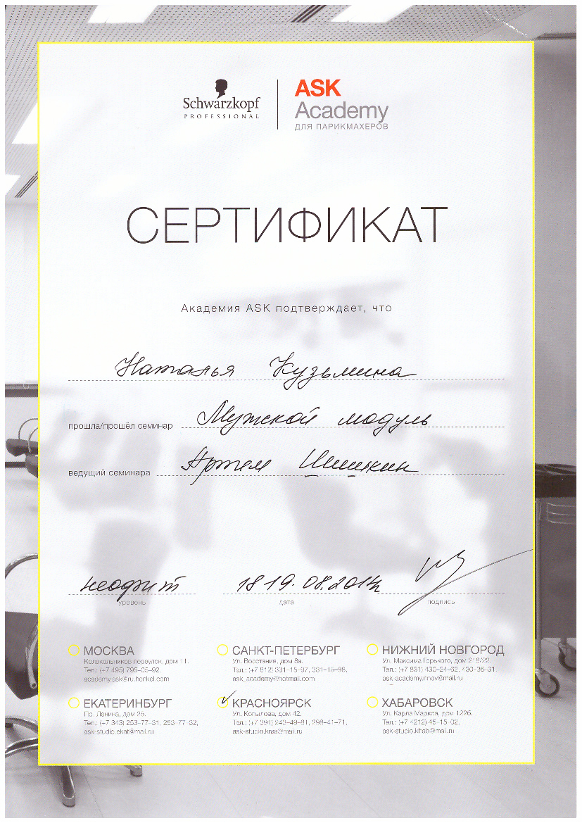 Август 2014 г ., Красноярск, Международная академия красоты "Профи - центр". Студия ASK Schwarzkopf Professional - семинар "Мужской модуль"