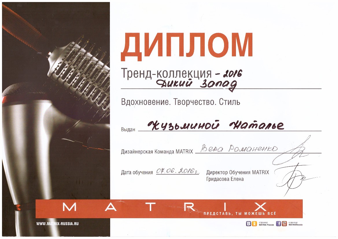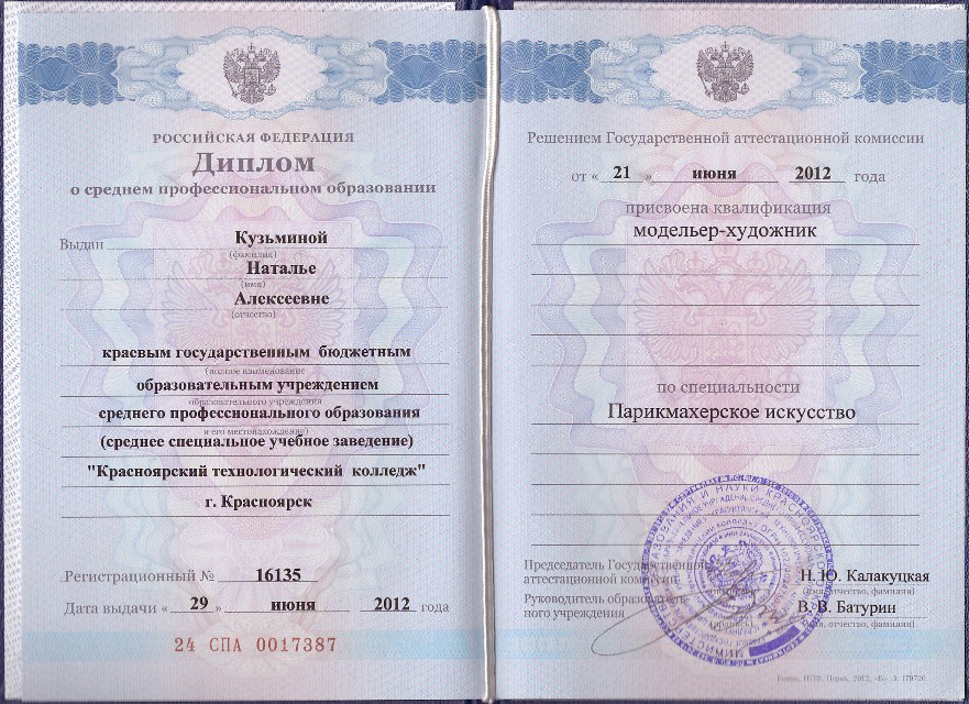 Июнь 2012 г., Красноярск, Красноярский технологический колледж - присвоена квалификация модельер - художник по специальности "Парикмахерское искусство".