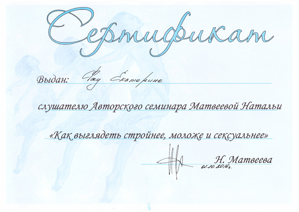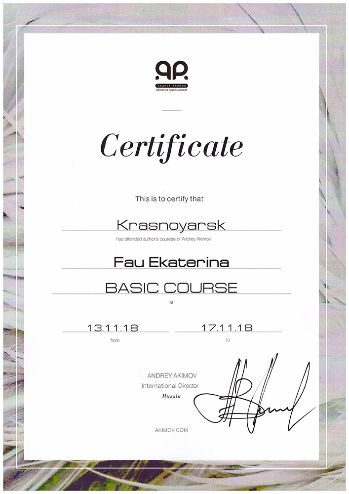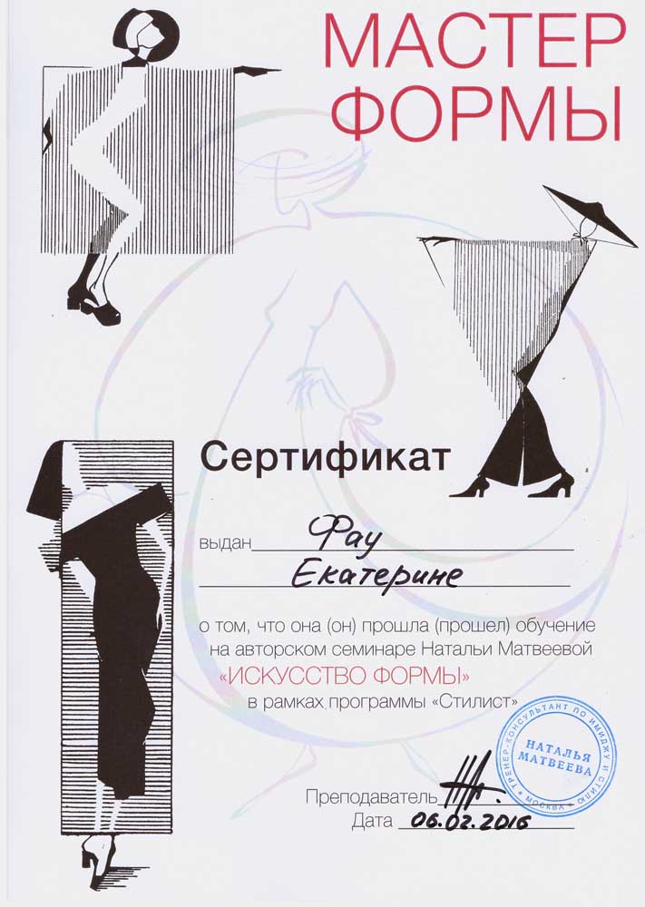 Февраль 2016 г. г. Красноярск, Студия Wella - Авторский семинар "Искусство формы". Преподаватель Матвеева Наталья, тренер - консультант по имиджу, стилю и цвету Американской компании "Beauty For All Seasons", партнер Академии парикмахерского искусства "Долорес", автор и тренер креативного курса Fashion week по повышению квалификации специалистов в области моды и стиля, автор курса "Имидж-мастер", преподаватель школы Сreate in Riga (Латвия). специалист по цветотерапии компании "Aura Soma". г. Москва. Присвоено звание "Мастер формы".