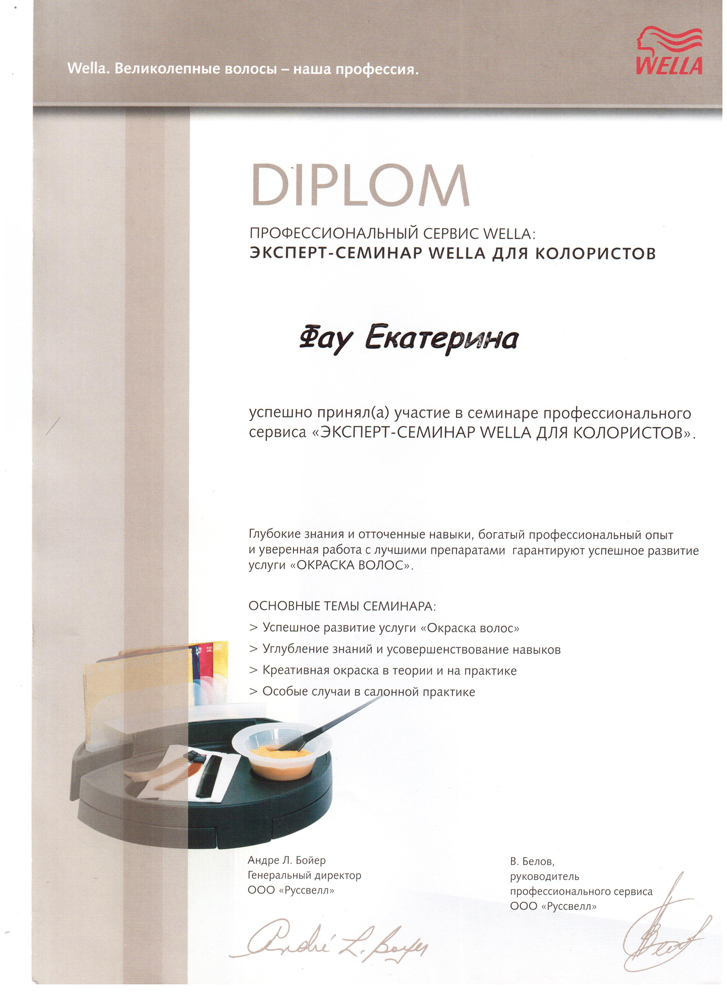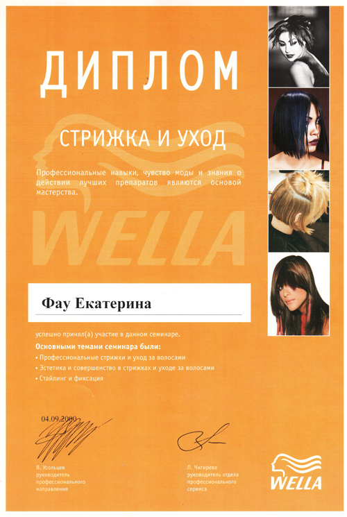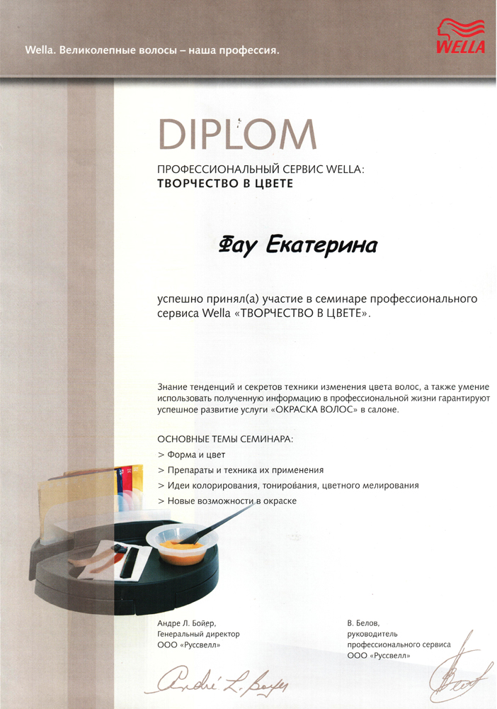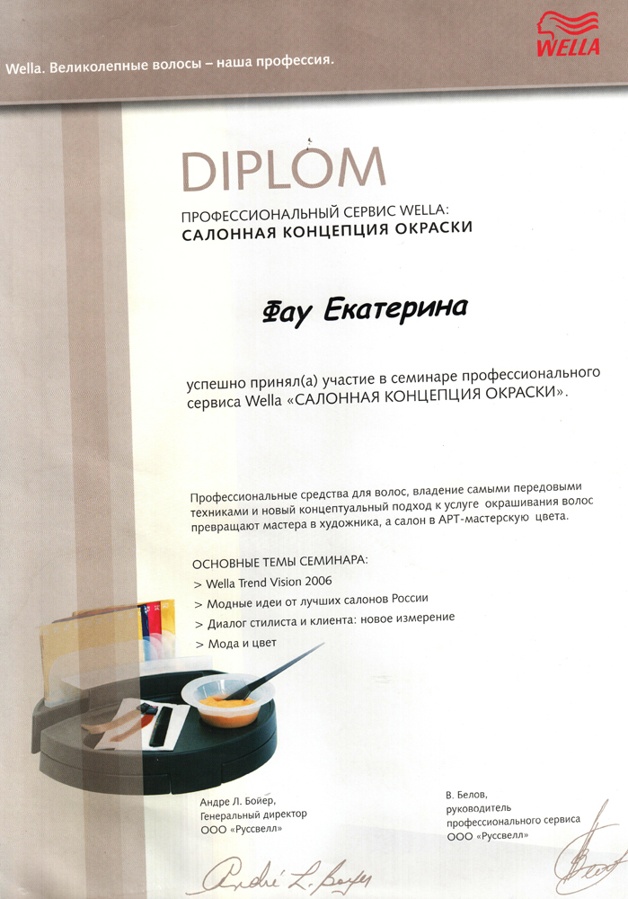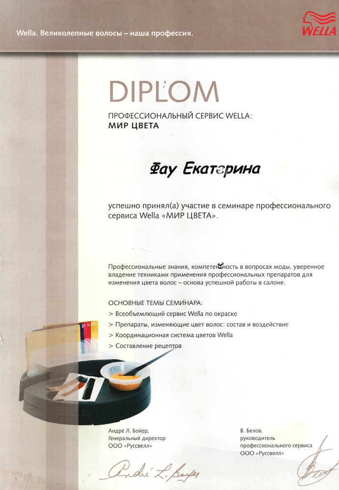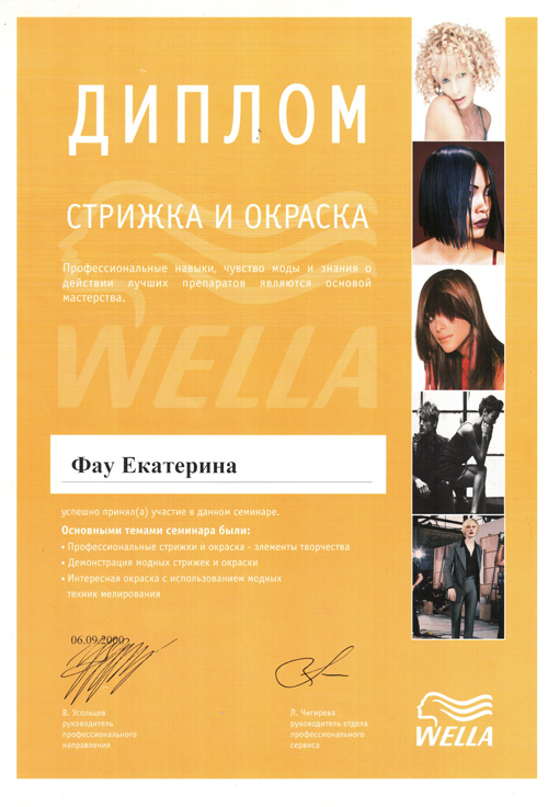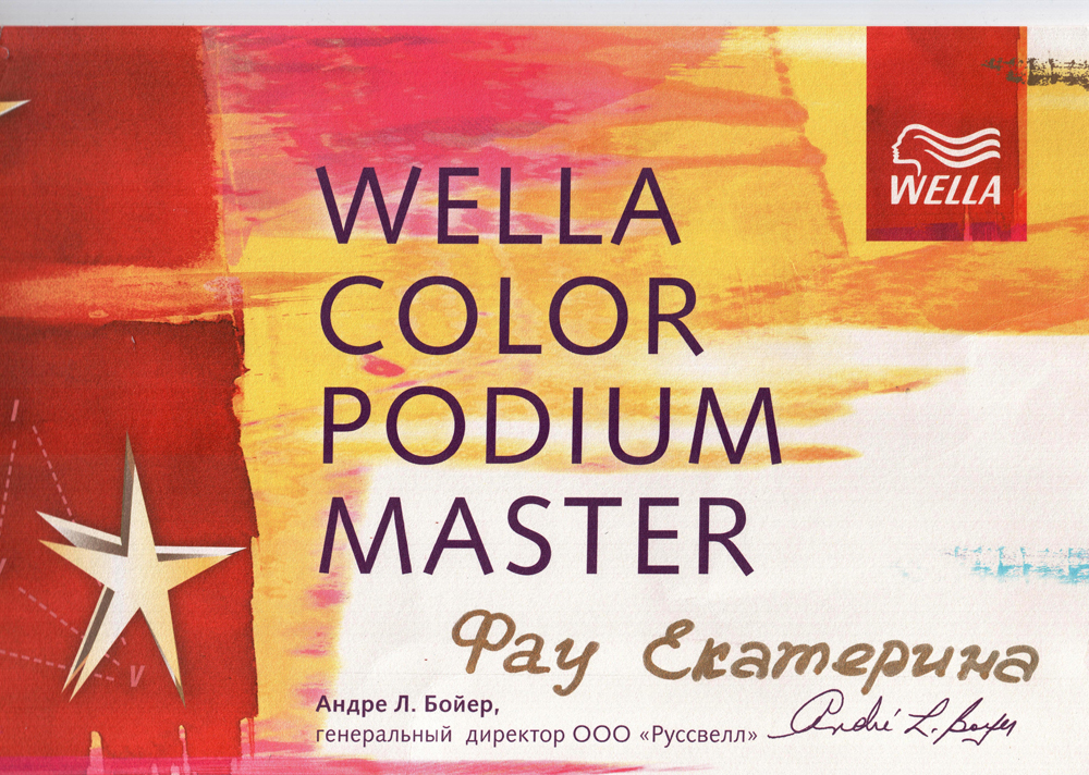 Октябрь 2006 г. Новосибирск, студия Wella - Семинар «Креативный курс».– престижное сообщество мастеров и салонов. Присвоение звания WELLA COLOR PODIUM MASTER