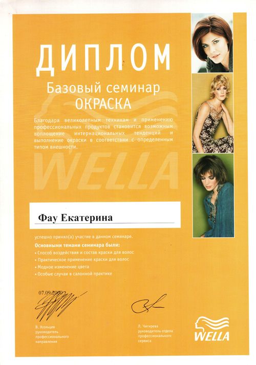 Июль 2006 г. Новосибирск, студия Wella - Семинар «Мир Цвета». Препараты и технология применения; расширение профессиональных знаний и отработка навыков.