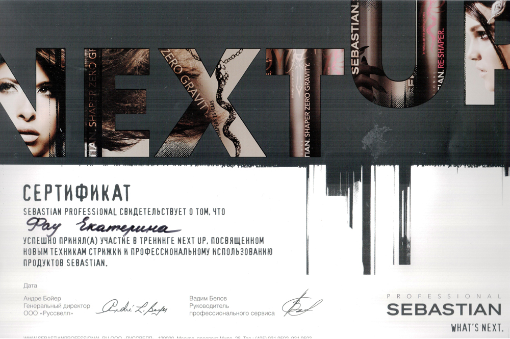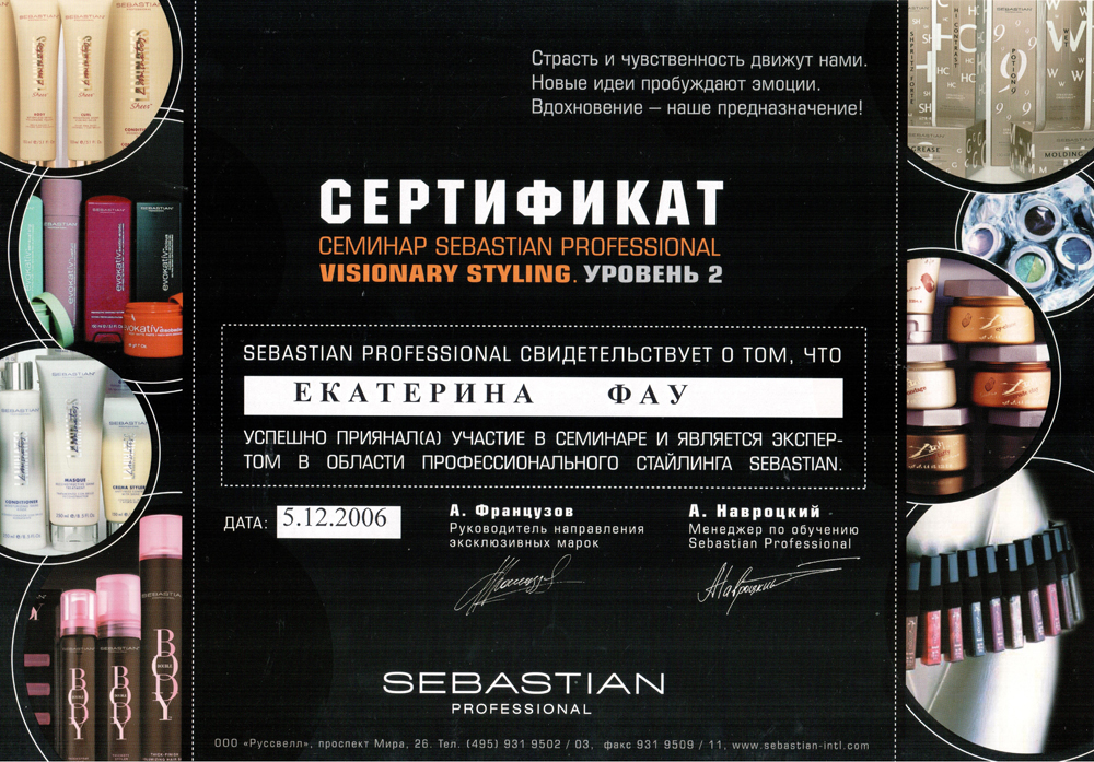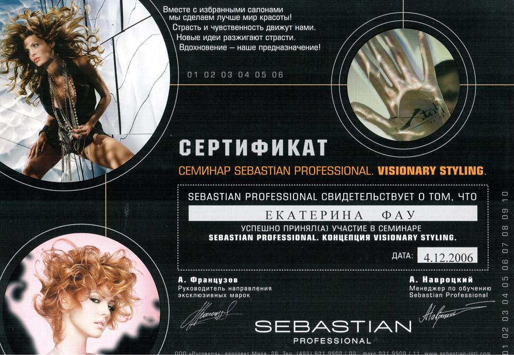 Декабрь 2006 г. Новосибирск, студия Wella - Семинар «Sebastian Professional». Visionary styling. Уровень 2. Эксперт в области профессионального стайлинга Sebastian.