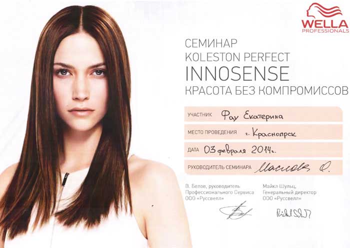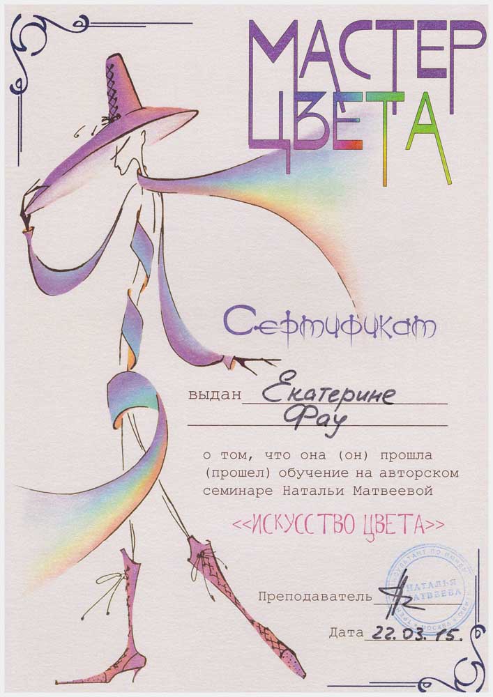 Март 2015 г. г. Красноярск, Студия Wella - Авторский семинар "Искусство цвета". Преподаватель Матвеева Наталья, тренер - консультант по имиджу, стилю и цвету Американской компании "Beauty For All Seasons", партнер Академии парикмахерского искусства "Долорес", автор и тренер креативного курса Fashion week по повышению квалификации специалистов в области моды и стиля, автор курса "Имидж-мастер", преподаватель школы Сreate in Riga (Латвия). специалист по цветотерапии компании "Aura Soma". г. Москва. Присвоено звание "Мастер цвета".