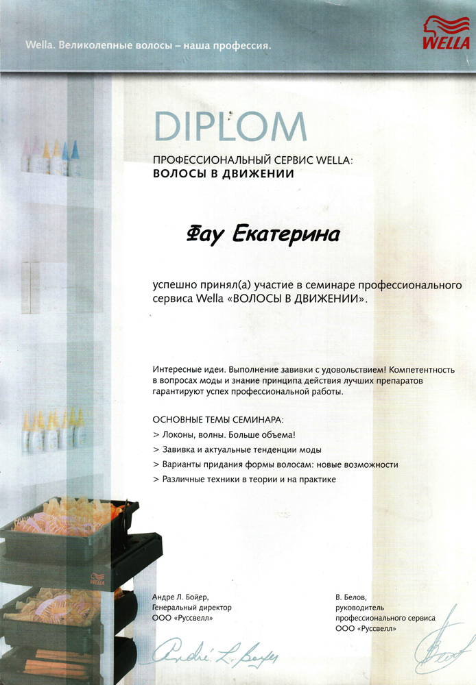 Июль 2006 г. Новосибирск, студия Wella - Семинар "Волосы в движении". Основные темы семинара: -Локоны, волны. Больше объема! - Завивка и актуальные тенденции моды. - Варианты придания формы волосам: новые возможности. - Различные техники в теории и на практике.