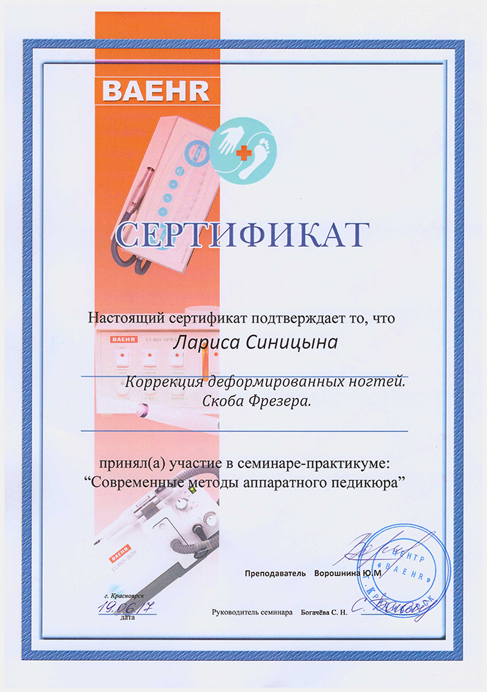 Июнь 2017 г. Красноярск, учебный центр "BAEHR" - cеминар - практикум: "Современные методы аппаратного педикюра" "Коррекция деформированных ногтей. Скоба Фрезера".